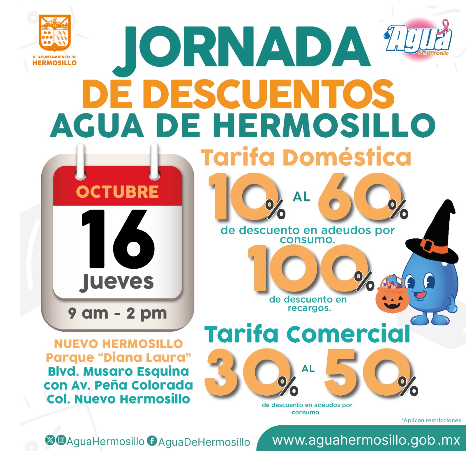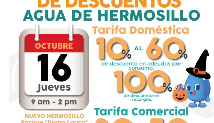 Agua de Hermosillo invita a usuarios con tarifa doméstica y comercial a participar en su próxima Jornada de Descuentos, que se llevará a cabo el jueves 16 de octubre, en el Parque Diana Laura, ubicado en la colonia Nuevo Hermosillo, en horario de 9:00 a.m. a 2:00 p.m.