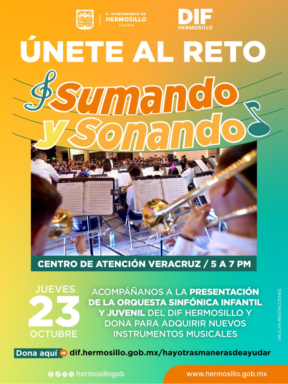 Quedan pocos días para que las y los hermosillenses se sumen al reto “Sumando y Sonando”, una iniciativa de Tesorería Municipal y DIF Hermosillo que combina el talento musical con la solidaridad, para dotar de nuevos instrumentos a la Orquesta Sinfónica Infantil y Juvenil.